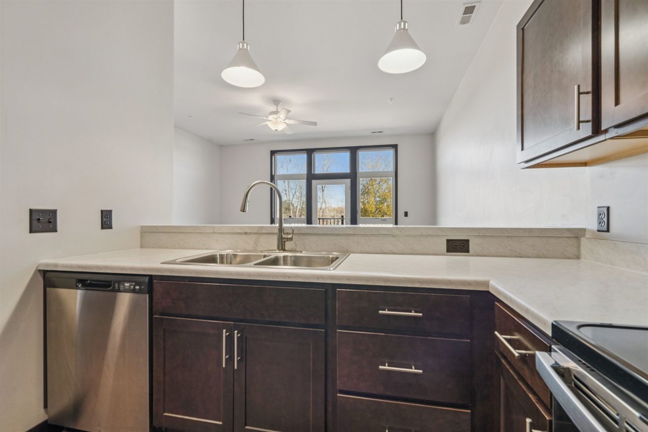 Indulge in simplistic, low-maintenance living with this beautifully designed second-floor condominium, ideally situated near the Maquoketa River and Historic Downtown Dyersville. Thoughtfully crafted, this condo offers 1 bedroom and 1 full bathroom, with an efficient layout that blends comfort and convenience. Step inside to a spacious living room, where large windows create a bright, inviting atmosphere and connect you to the surrounding community. The open-concept kitchen is designed with both convenience and entertaining in mind, featuring an eat-at island and stainless steel appliances. Enjoy time outdoors on your private north facing deck or common easterly patio, a peaceful retreat to relax and unwind. This unit also includes garage space, adding everyday convenience. Perfectly positioned with easy access to downtown Dyersville's restaurants, boutiques, breweries, walking trails, and local attractions, as well as the scenic views, this condo offers the ideal blend of location, accessibility, and easy living. Whether you're seeking a full-time residence, a low-maintenance retreat, an investment opportunity, or a place to be closer to family, this condo delivers comfort and convenience in a highly desirable setting. Schedule your private showing today and experience firsthand all this property has to offer. $159,900 120 Twin Steeples Circle NE Unit 215 Dyersville, IA